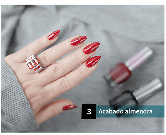 La forma de almendra se caracteriza por ser ancha en la base y ligeramente redondeada en los costados y en la punta. Otorga practicidad y comodidad sin perder el estilo.