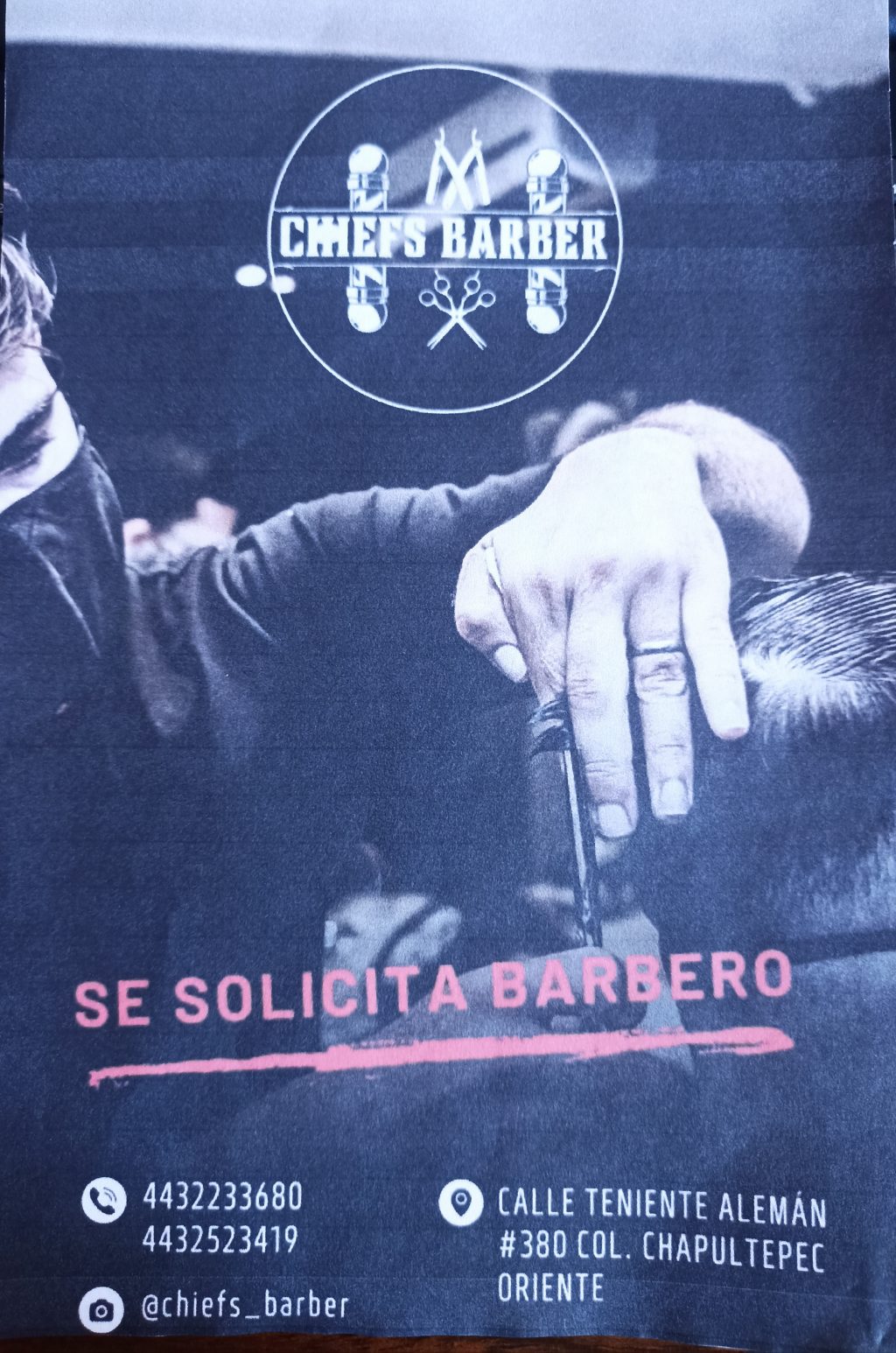 Atendiendo el llamado que nos realizarón los propietarios del Estudio Chiefs Barber, les mostramos la vacante para Barbero. Para más información acudir a la dirección o bien, a los telefonos indicados en la ilustración.